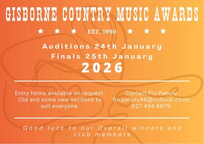 The Gisborne Country Music Awards will take place January 24th (Auditions) and 25th (Finals) at the War Memorial Theatre, Gisborne